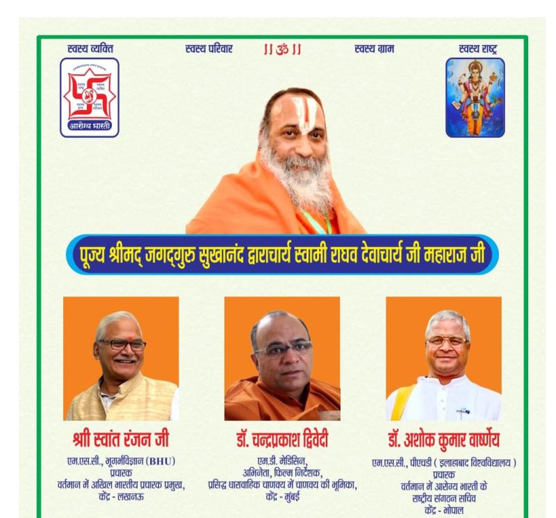 आरोग्य भारती, भोपाल महानगर पिछले 11 वर्षों से लगातार “My Health is My Responsibility” के मूलमंत्र पर आधारित मासिक स्वास्थ्य-व्याख्यानमाला का आयोजन कर समाज में स्वास्थ्य-जागरूकता का व्यापक प्रसार कर रहा है। इसका ध्येय है – आरोग्यम् मम् स्वभावः, अधिकारः, कर्तव्यं च” अर्थात् स्वास्थ्य को व्यक्तिगत जिम्मेदारी मानकर स्वस्थ समाज और राष्ट्र निर्माण में योगदान देना।