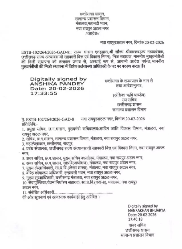 रायपुर: सौरभ श्रीवास्तव OSD नियुक्त, पुलक भट्टाचार्य को अतिरिक्त प्रभार